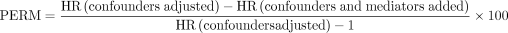 Percentage of excess risk medicated (PERM)は、要因とアウトカムの関連性が、mediatorで調整した場合の、どの程度変動するかによって計算されます。