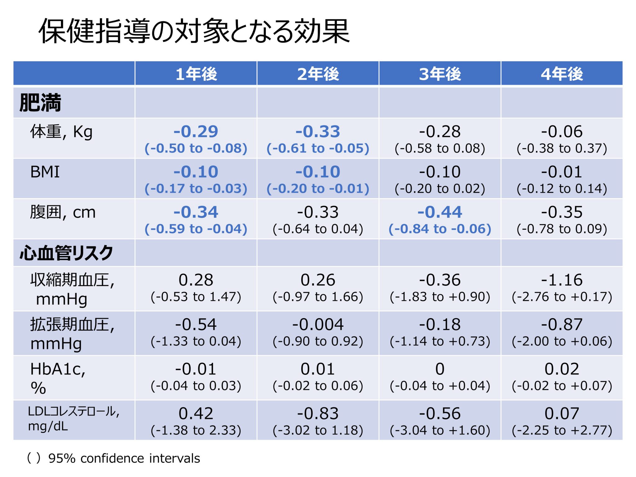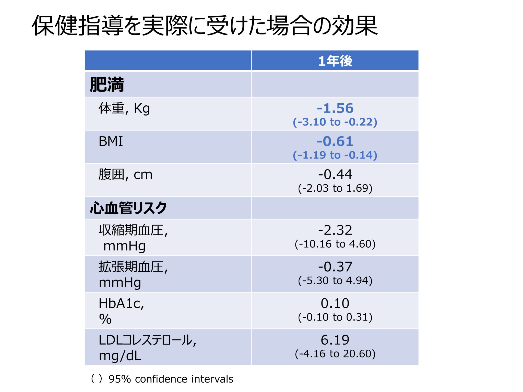 「保健指導の対象となった効果」を整理すると、1年後の健康アウトカムについては、軽度の肥満改善を認めるが、心血管リスクの改善は認めないという結果が得られました。また肥満の改善は3年目以降で差が検出できなくなりました。これらの結果は、初回指導に限定した場合、女性を対象に分析した場合も同様でした。