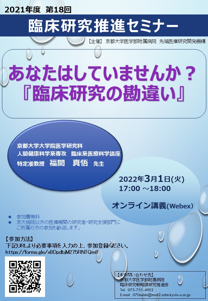 当研究室の福間が京都大学病院臨床研究セミナーで講演します。