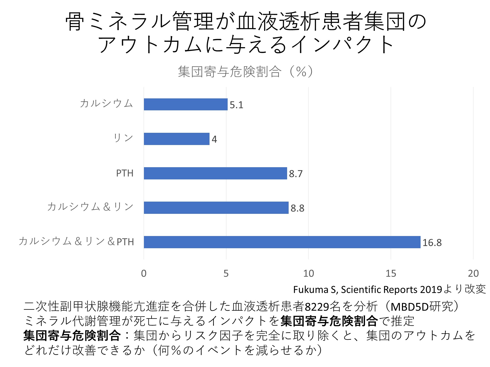本研究では、MBD5D研究(https://www.ncbi.nlm.nih.gov/pubmed/21426510)のデータを分析し、二次性副甲状腺機能亢進症を有する血液透析患者集団において、骨ミネラル管理が死亡に与えるインパクトを集団寄与危険割合で推定しました。