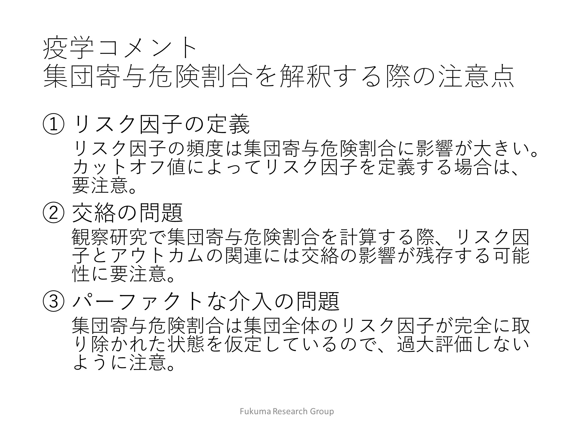 集団寄与危険割合は、特定のリスク因子が集団全体のアウトカムに影響する程度を示す疫学指標です。集団全体からリスク因子を除去した際に、どれくらいイベントを減らすことができるかどうかを示します。集団寄与危険割合は、リスク因子の頻度、及びリスク因子とアウトカムの関連から計算されます。集団寄与危険割合の結果を解釈する際には、特に以下の3点について注意が必要です。